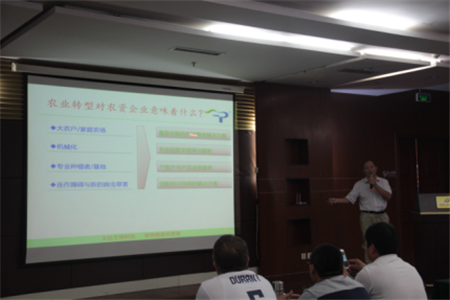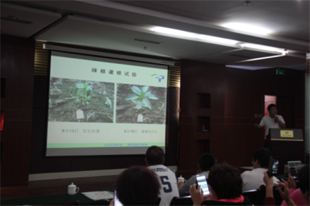 四川太抗華北區(qū)域總經理張克東就太抗?系列產品、當今農藥發(fā)展方向和趨勢進行了詳細的剖析和講解——現(xiàn)階段正處于未來農業(yè)發(fā)展的風口,規(guī)模農業(yè)、現(xiàn)代農業(yè)示范園和生態(tài)農業(yè)是發(fā)展方向,隨農業(yè)轉型而變的是農資企業(yè)的轉變,量身定制的作物整體解決方案、專業(yè)的技術指導與服務、產前產中產后全程服務、創(chuàng)新的可持續(xù)的解決方案是農資企業(yè)生存的必選之路,連作障礙和新生病蟲草害是現(xiàn)代農業(yè)面臨的難題與痛點。緊接著他介紹了太抗?枯芽春TM和太抗?哈茨木霉菌的優(yōu)勢及其在作物病害上的作用機理。