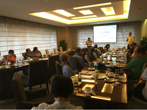會上,董事長黃永博士詳細講解了太抗系列產(chǎn)品的作用機理及各地應用案列,得到了所有與會人員的高度關(guān)注。當講到太抗產(chǎn)品的安全性時,外賓們紛紛將在燒杯中的樣品看了又看,聞了又聞,可能實在覺得看似酸奶的生物農(nóng)藥著實稀奇。PPT放映結(jié)束后,外賓們接連提問,關(guān)于產(chǎn)品的保質(zhì)期、使用技術(shù)、投入產(chǎn)出比等等,董事長一一解答,連喝水的空都沒有。其中,來自來自維多利亞州的Gary Jeans講到其種植有4000公頃有機李用于出口中國,非常希望能用上太抗系列產(chǎn)品!此外,有外賓提出想帶些樣品回澳洲,也有外賓提出想和我公司澳洲研發(fā)人員深入交流,更有外賓要了黃董厚厚一疊名片說是要去澳洲幫我們做宣傳!