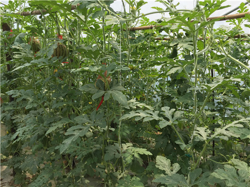 在紅巖鎮(zhèn)政府的推薦下,合作社從今年3月15日西瓜苗移栽后開始全程使用太抗幾丁聚糖植物誘抗劑、太抗枯芽春枯草芽孢桿菌、太抗木子美哈茨木霉菌等一系列生物農(nóng)藥用于防治病害。至5月下旬,共施藥6次,病害得到有效控制。期間發(fā)生了蔓枯病和枯萎病,用太抗-幾丁加太抗-枯芽春兩次之后明顯控制住了病情,無病毒病發(fā)生。